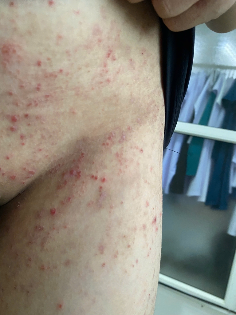 Tổn thương khác thường do ngứa gãi gây nên: vết xước, sẩn, trợt, vảy tiết, mụn nước, mụn mủ, chốc hóa, sẹo thâm màu, bạc màu. Thương tổn dai dẳng gây biến chứng nhiễm khuẩn, chàm hóa.