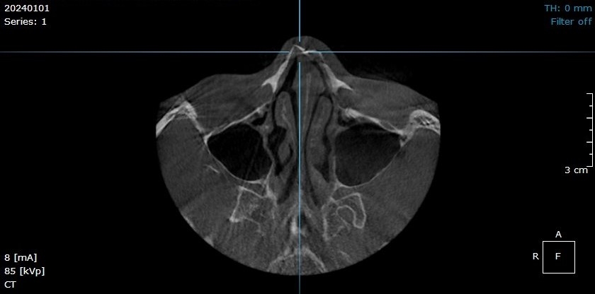 Bệnh nhân bị chấn thương đến thăm khám tại Hồng Hoàng, thông qua hình ảnh chụp CLVT răng hàm mặt dưới đây chẩn đoán bệnh nhân bị gãy xương mũi.